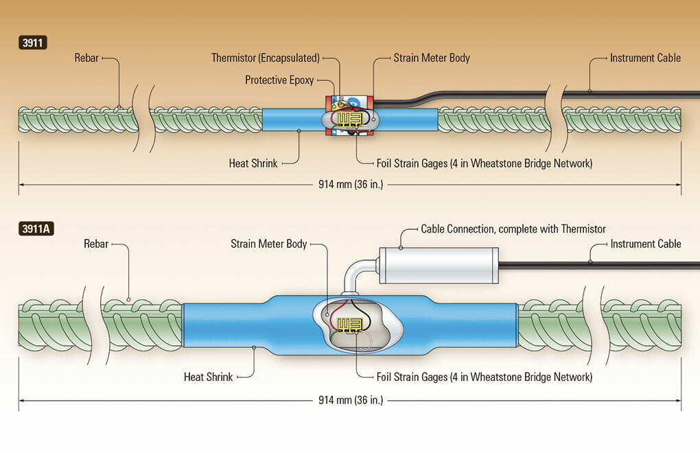 Model 3911 được thiết kế để buộc dây vào song song với cốt thép. Độ lệch nhỏ của thanh giúp giảm thiểu ảnh hưởng của nó đến mô hình mặt cắt của bê tông. Cáp thoát ra khỏi máy đo biến dạng thông qua một lớp epoxy bảo vệ nhỏ. Model 3911A tương tự như 3911, bao gồm chiều dài ngắn của thép cường độ cao được hàn giữa hai đoạn thanh cốt thép dài 18 “(457 mm). Đường kính của 3911A thay đổi trong khoảng từ 0,5 “(12,5 mm) đến 1,375” (35 mm) tương ứng với kích thước thép cây kết cấu, giữa các phần mà nó sẽ được hàn. Cáp thoát ra qua khớp nối khuỷu tay Swagelok (hoặc tương tự). Model 3911 và 3911A thường được lắp đặt theo cặp ở hai bên trục trung tính của bộ phận kết cấu đang được khảo sát. Điều này được thực hiện để có thể phân tích mômen uốn, ngoài tải trọng dọc trục.